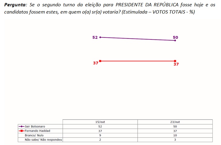 Considerando os votos totais, Jair Bolsonaro tem 50% das citações (eram 52%) e Fernando Haddad, do PT, alcança 37% das menções entre os eleitores brasileiros (mesma intenção de voto verificada anteriormente). Aqueles que declaram votar em branco ou anular o voto somam 10% e os que não sabem ou não respondem totalizam 3% (eram 9% e 2%).