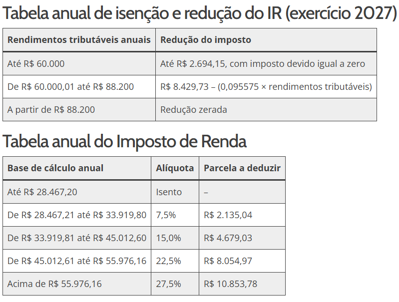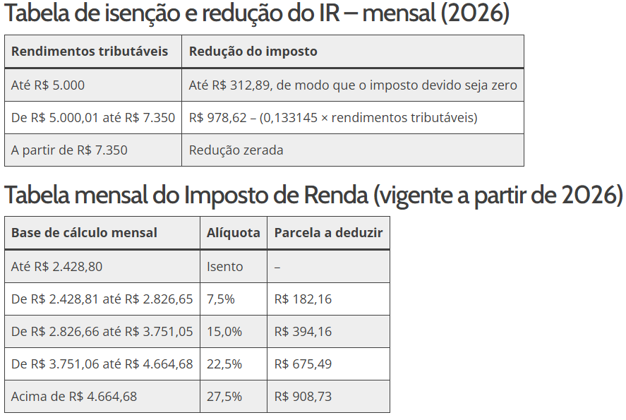A partir de 2026, o sistema passa a operar com duas tabelas simultâneas. Por um lado, permanece a tabela tradicional, com alíquotas de 7,5% a 27,5%. Por outro, entra em vigor uma tabela específica de isenção e redução, criada exclusivamente para atender às faixas beneficiadas pela nova lei.