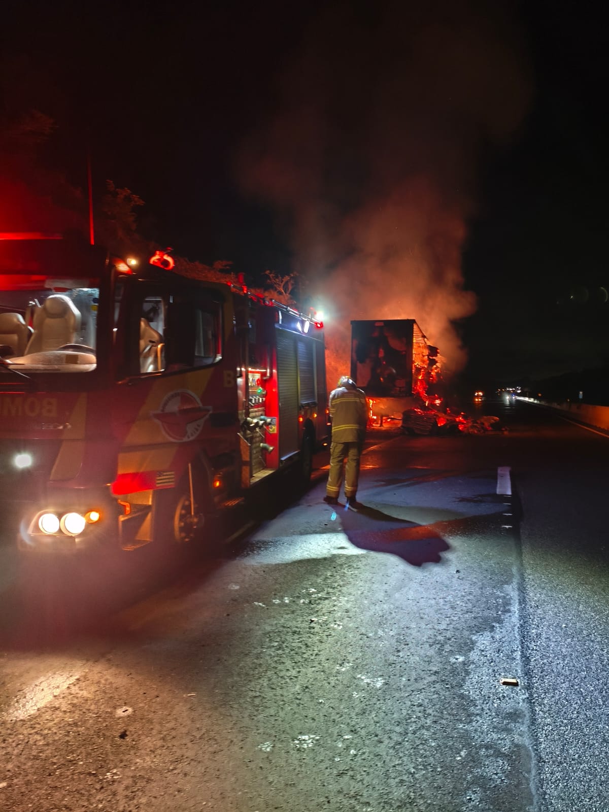 A ocorrência começou por volta das 21h38. Ao chegar ao local, os bombeiros encontraram apenas o reboque da carreta. Além disso, o fogo já consumia toda a carga.