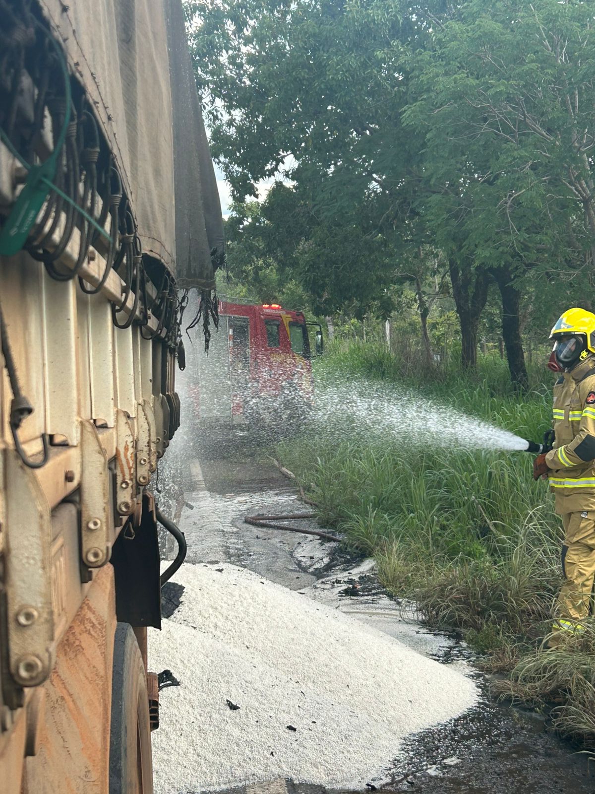 As chamas danificaram parte do assoalho e provocaram o derramamento parcial da carga de ureia sobre a pista. Diante do risco, a equipe isolou a área e adotou medidas de segurança para proteger os motoristas que trafegavam pela rodovia.