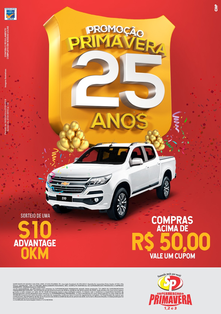 Começou a valer hoje, sábado, 24 de fevereiro, a Promoção Compra Premiada a rede catalana de Supermercados Primavera. Juntos, as três lojas estarão sorteando em comemoração aos 25 anos de Supermercado Primavera, uma caminhonete Chevrolet S 10 0 km.