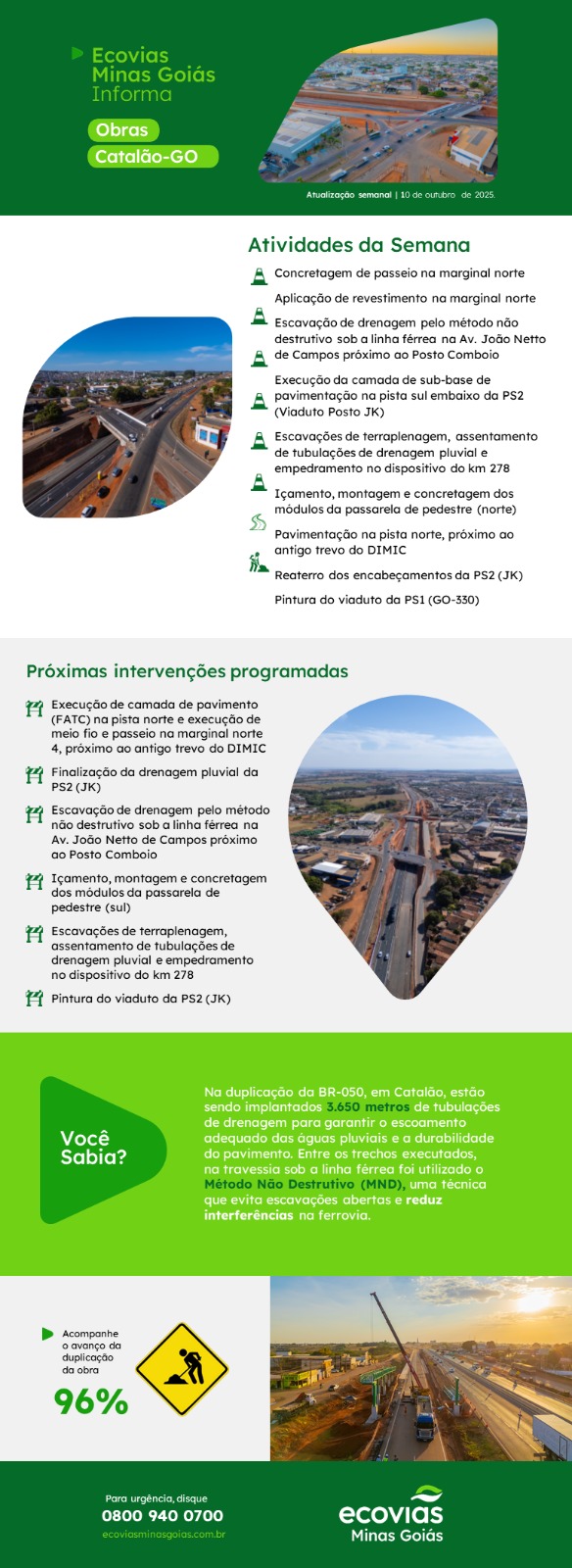 Além da interdição temporária, a Ecovias Minas Goiás divulgou as atividades da semana no trecho de Catalão (GO), que fazem parte do processo de duplicação da rodovia. Entre os serviços realizados estão: