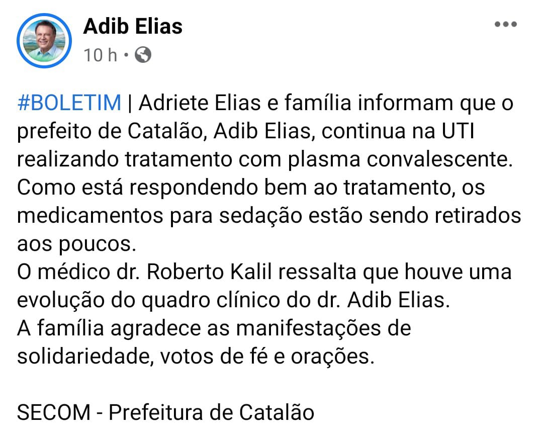Adib Elias foi hospitalizado no último dia 10 de janeiro no Hospital São Nicolau, em Catalão, após apresentar sintomas da doença. No dia seguinte (11), por opção particular e da família, foi transferido em voou particular para o Instituto do Coração (Incor), em São Paulo, onde após resultados e avaliações médicas, ficou decido que Adib permaneceria no Incor, descartando como anunciado a primeiro momento, sua internação no Hospital Israelita Albert Einstein.