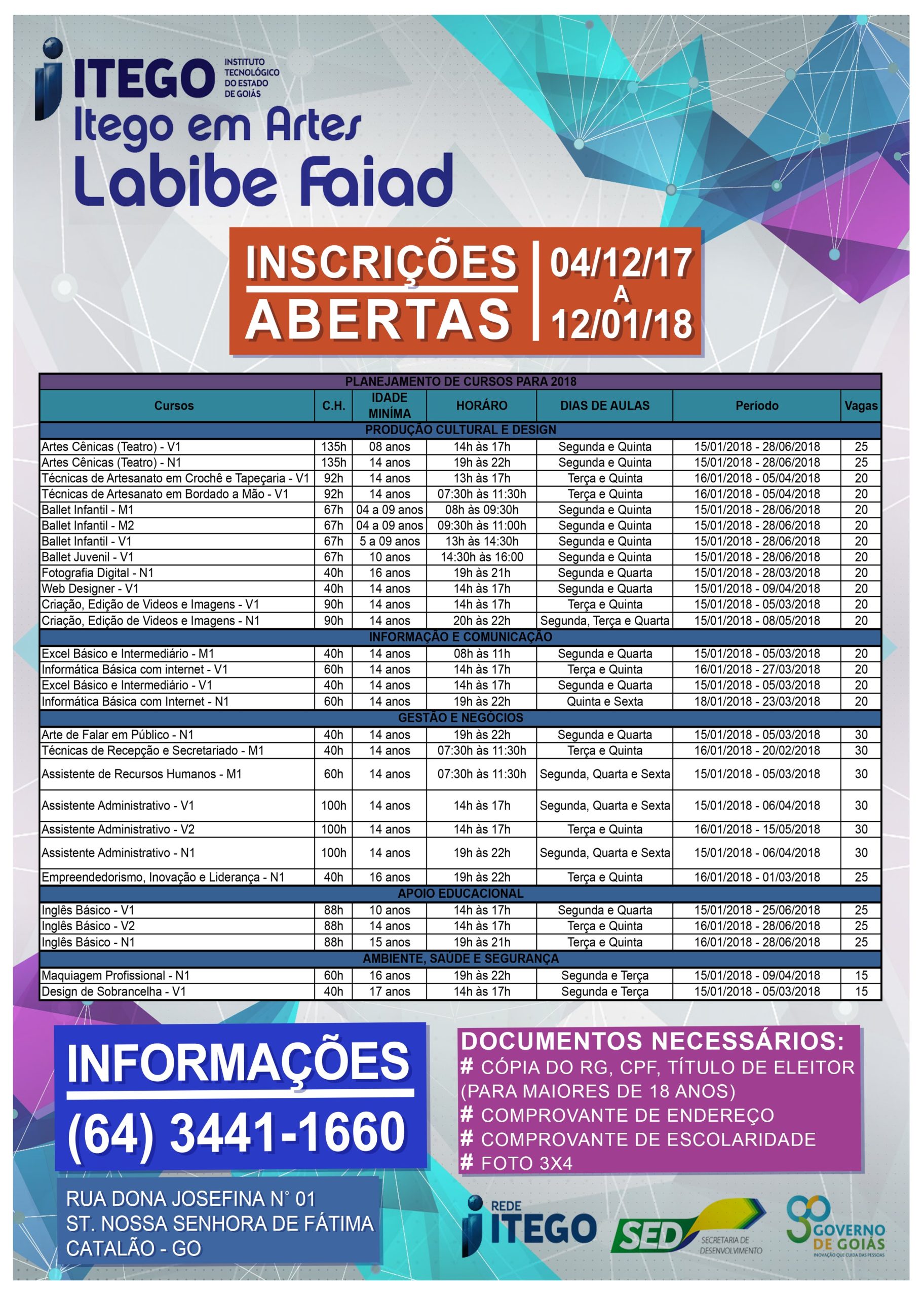 As matrículas irão até o dia 12 de janeiro de 2018 e serão feitas exclusivamente no Itego em Artes Labibe Faiad, situado na Rua Dona Josefina no. 01, Bairro Nossa Senhora de Fátima, em Catalão.
