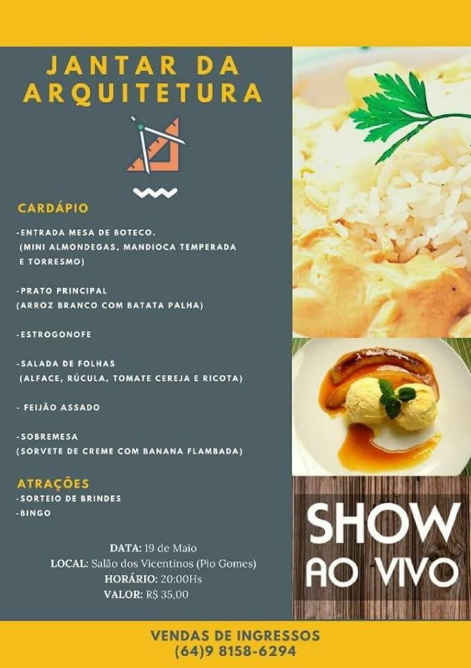 A turma do curso de Arquitetura e Urbanismo de uma universidade privada de Catalão, estará promovendo no próximo final de semana, um jantar para arrecadação de fundos com a finalidade de realizar um projeto.