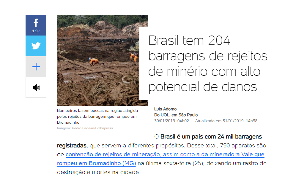 O maior portal de notícias da internet no país, o UOL.com, destacou no último domingo (03), que o Brasil é um país que possuí 24 mil barragens registradas, que servem a diferentes propósitos, e deste total, 790 barragens são de concentração de rejeitos de mineração, como a de Brumadinho da mineradora Vale.