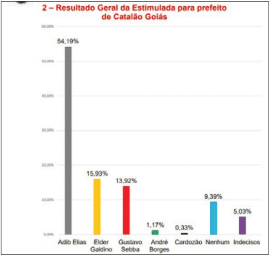 Na pesquisa estimulada com cartela, onde o entrevistado escolhe o nome preferido, Adib Elias tem 54,19% – 22,84% a mais do que a soma de todos os adversários. Elder Galdino (MDB) é o segundo, com 15,93%, seguido de Gustavo Sebba (PSDB), com 13,92. André Borges (PSL) soma apenas 1,17%; Cardozão (PT), 0,33%. Anulariam o voto, 9,39% e 5,03 se disseram indecisos.