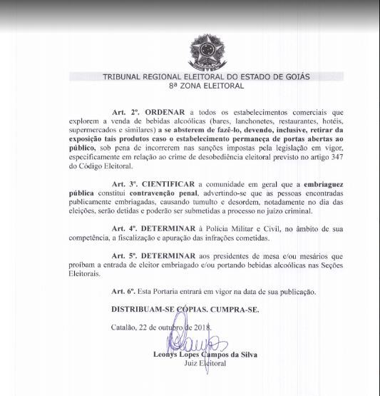 Juiz da 8ª Zona Eleitoral proíbe a venda de bebidas alcoólicas em Davinópolis no próximo domingo; eleitores irão participar do 2º turno das eleições presidenciais e eleição suplementar para Prefeito e Vice-Prefeito