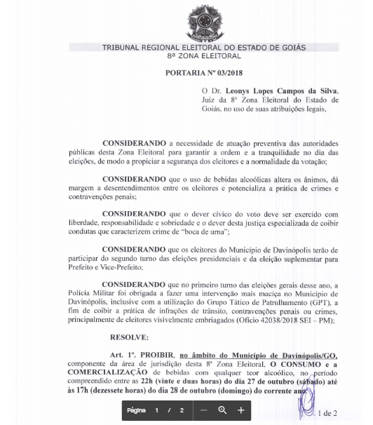 O Juiz da 8ª Zona Eleitoral, Leonys Lopes Campos da Silva, baixou uma Portaria proibindo a comercialização de bebidas alcoólicas no próximo domingo (28) nos estabelecimentos comerciais da cidade de Davinópolis, em decorrência das eleições de 2º turno para escolha do novo Presidente da República do nosso país, e principalmente, devido a eleição suplementar de escolha do novo Prefeito e Vice-Prefeito da referida cidade. A nova eleição em Davinópolis, se faz necessária em cumprimento de medida judicial, após o ex-prefeito Robson Gomes e Rony Rodovalho terem perdido os seus respectivos mandatos, depois de sofrem processo de cassação por compra de votos e abuso do poder político e de autoridade.