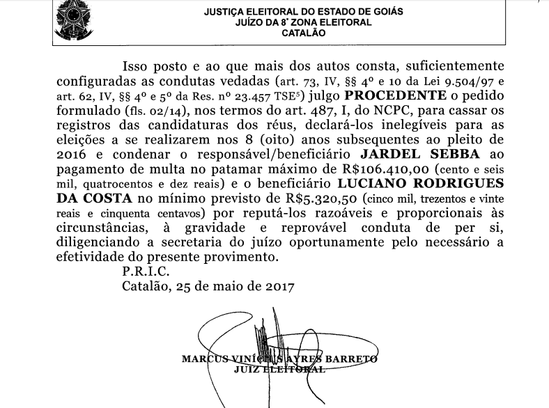 Em outra decisão proferida pelo Juiz da 8ª Zona Eleitora, Dr. Marcus Vinicius Ayres Barreto, por decorrência de compra de votos e distribuição de cheques reformas, Barreto tornou o ex-prefeito de Catalão e ex-presidente da Assembleia Legislativa de Goiás, Jardel Sebba (PSDB), inelegível pelos próximos oito anos.