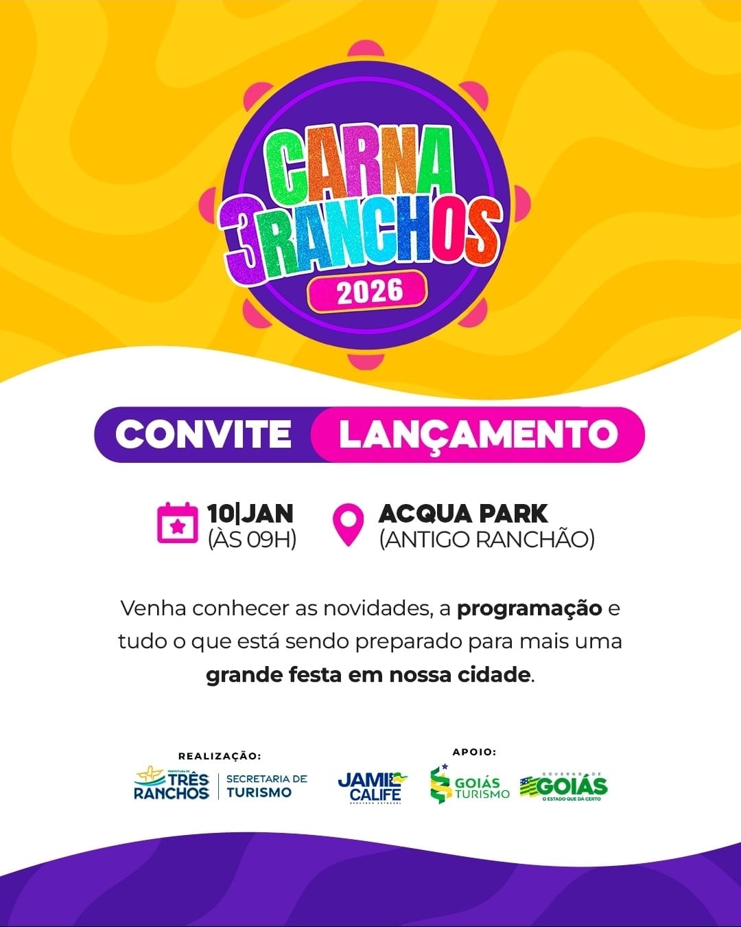 Em evento que será liderado pelo prefeito Haroldinho Calaça, a Prefeitura de Três Ranchos realiza neste sábado, 10 de janeiro, o lançamento oficial do Carnaval 2026. O evento começa às 9h, no Acqua Park (antigo Ranchão), com entrada gratuita.