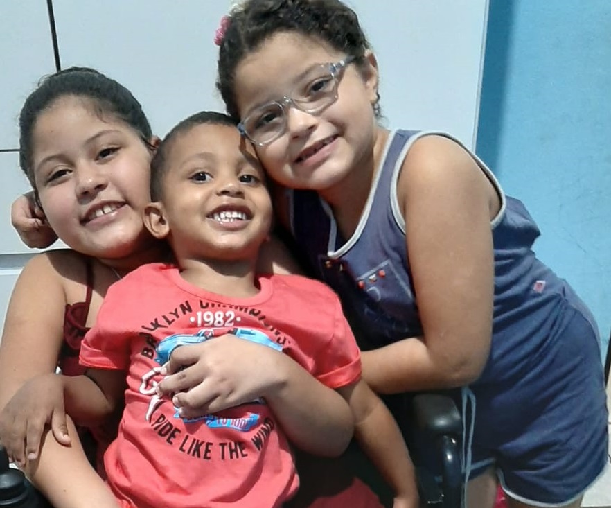 Isabelly, 12 anos, portadora da AME, segura a irmã Manuella de 9 anos e o pequeno Miguell de 4 anos de idade. Foto: Arquivo da família/Reprodução