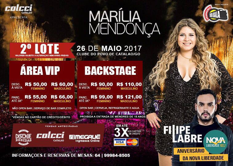 O sucesso da cantora Marília Mendonça é incontestável, o estilo sofrência sertaneja, cantada na voz feminina de timbre forte, marca de vez a evolução tecnológica da música sertaneja no Brasil. Pensando nessas mudanças e que agradam o público que amam o novo estilo de música sertaneja, é que a agência Trem Bala Eventos tem inovado e trazido para a cidade de Catalão os artistas de ponta no cenário nacional, como acontece na próxima sexta-feira, 26 de maio, no Clube do Povo, onde acontecerá o mega show da cantora Marília Mendonça.