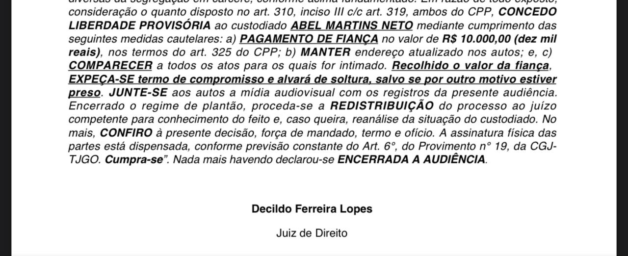Durante a audiência de custódia realizada neste sábado (17), o juiz Decildo Ferreira Lopes concedeu liberdade provisória ao médico Abel Martins Neto. A decisão incluiu o pagamento de uma fiança de R$ 10 mil, além do cumprimento de outras medidas cautelares.