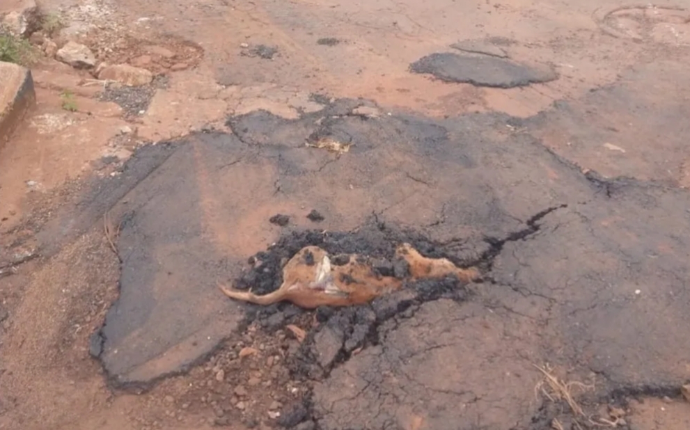 Um morador denuncia que taparam um buraco no asfalto com um cachorro dentro em Itumbiara, na Região Sul de Goiás. O salgadeiro Frederico Antônio Dias Barbosa, de 21 anos, disse que o animal já estava morto e que, após jogarem massa asfaltica sobre ele, parte do cão ficou exposta. Segundo ele, a população da cidade está revoltada. A informação foi publicada no site Surgiu.