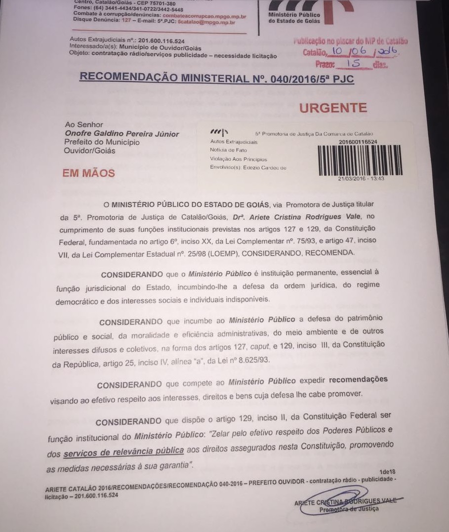 Lembrando que no início do mês o MP Goiás ajuizou Ação Civil Pública por atos de improbidade administrativa por superfaturamentos em contratos de prestação de serviços na área contábil da prefeitura. Mais uma vez Onofrinho, prefeito de Ouvidor, é surpreendido com determinação do MP de Goiás para cancelar imediatamente o contrato com a Rádio Comunitária Cidade FM, também considerado ilegal.
