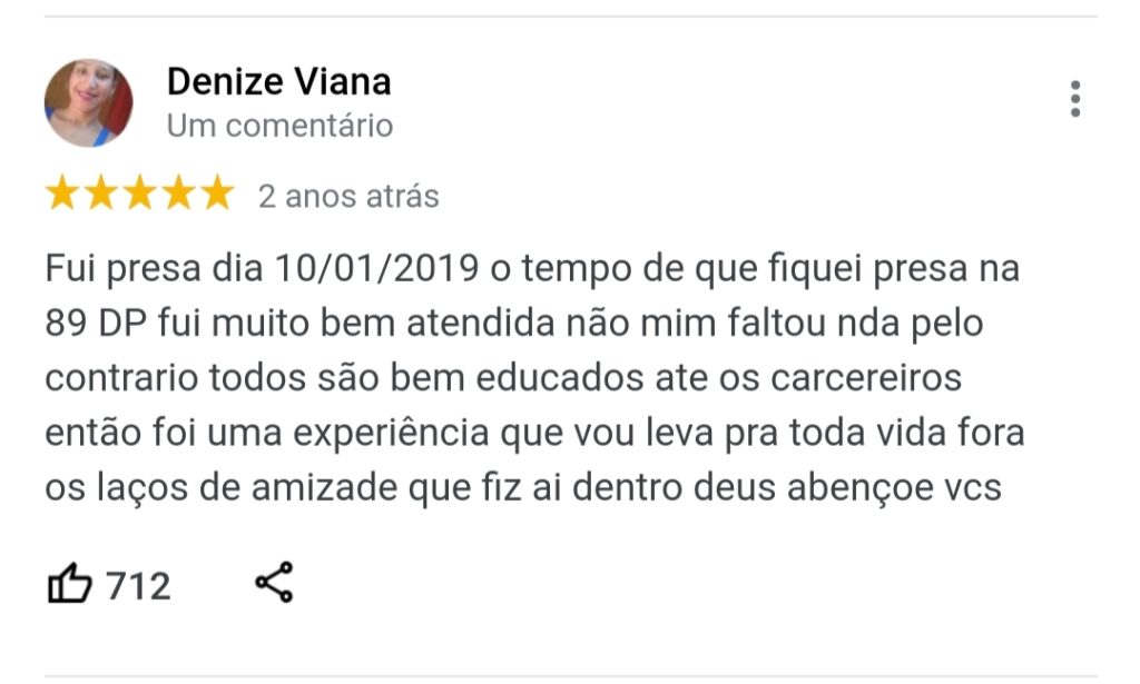 “Fui presa dia 10/01/2019 o tempo (sic) de que fiquei presa na 89 DP fui muito bem atendida não (sic) mim faltou nada pelo contrário, todos são bem educados, até os carcereiros, então foi uma experiência que vou (sic) leva pra toda vida fora os laços de amizade que fiz aí dentro, Deus (sic) abençoes vocês”, escreveu Denize Viana.
