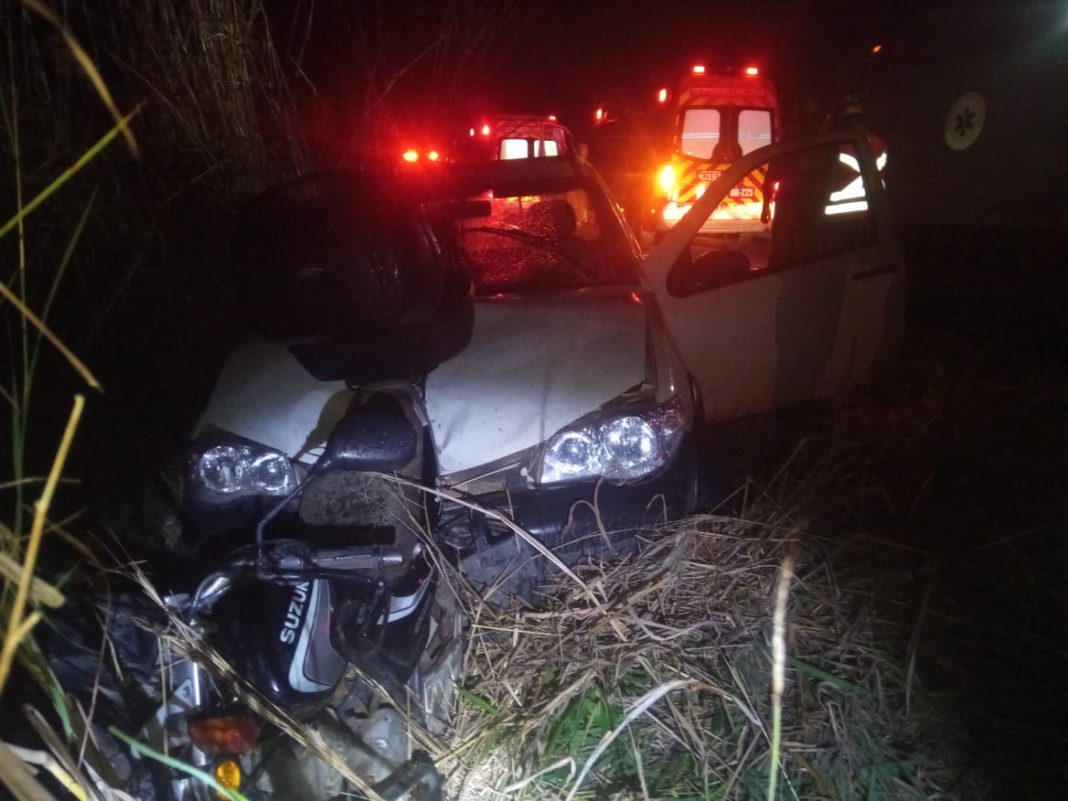 O impacto da batida foi tamanha, que a motocicleta ficou presa nas ferragens da picape. O condutor do utilitário não se feriu.