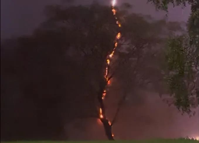Uma fazendeira da zona rural de Nerópolis, localizada na região metropolitana de Goiânia, capturou um evento impressionante em vídeo. O registro mostra o momento exato em que um raio atinge uma área de sua propriedade. Apesar da intensidade do clarão no céu e da ‘linha’ de fogo visível no tronco de uma árvore, felizmente nenhum ferimento foi relatado, de acordo com a moradora, que preferiu não revelar sua identidade.