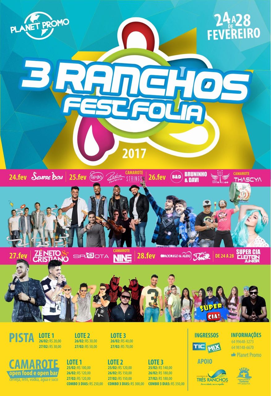 O prefeito Hugo Deleon (PSDB), busca alternativas para realizar os eventos e atrair os turistas para Três Ranchos. Uma ideia louvável e que tem gerado resultados positivos iniciada na gestão do seu antecessor, Rolvander Pereira (PSDB), foi o carnaval feito em Parceria Público Privada (PPP) com a empresa Planet Promo de Catalão, que ficou a cargo de contratar a grade artística a se apresentar no Sambódromo na cidade do Lago Azul.