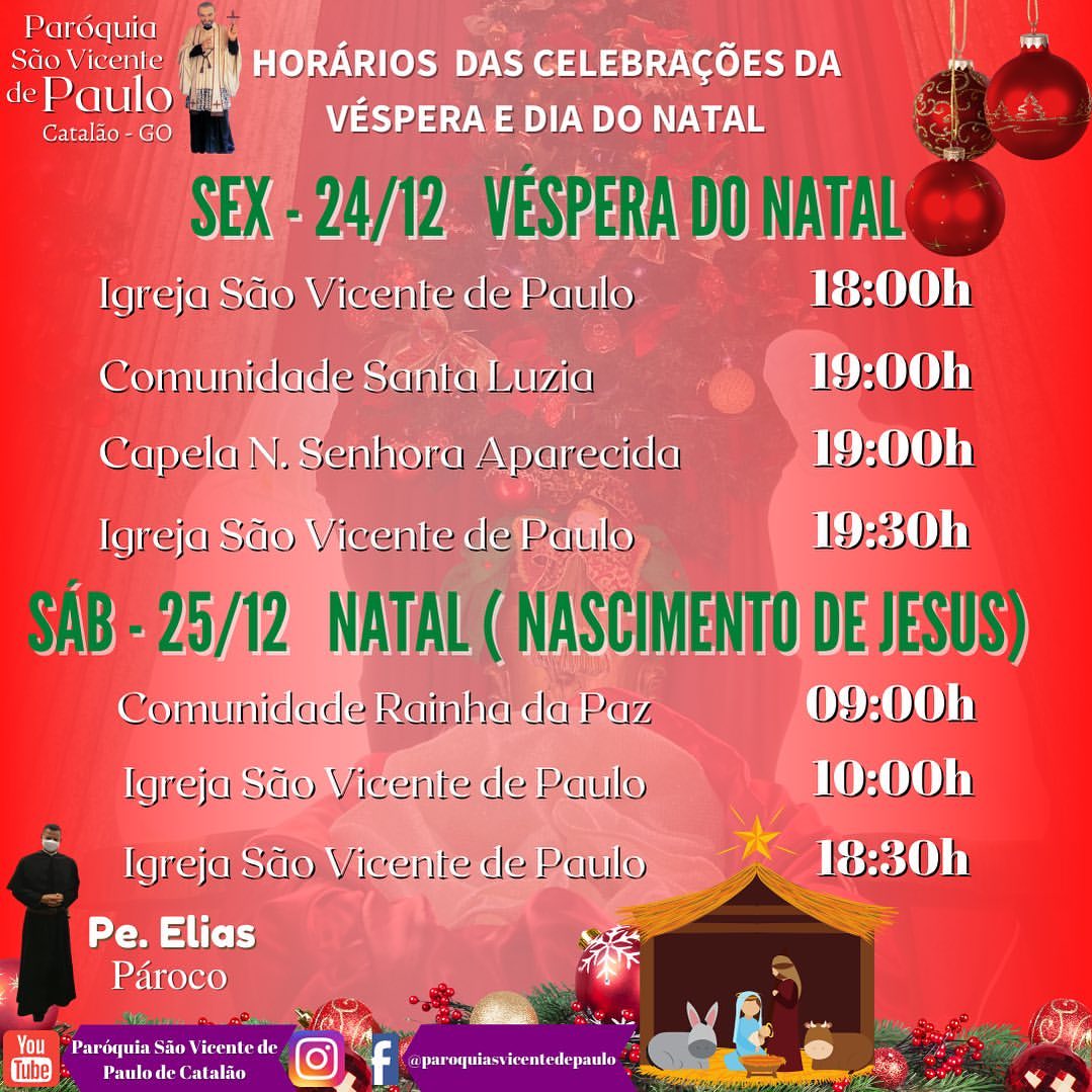 Bom! Aqui está os dias e horários das celebrações das Missas de Natal nas principais igrejas da cidade de Catalão. Que você leitor (a), tenha um Natal de muitas bênçãos, de orações e de muita fé!
