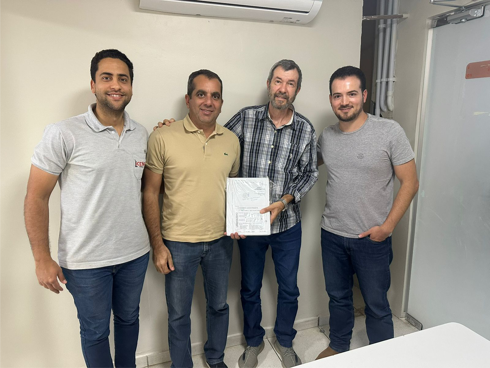 Na foto estão Samuel Gonçalves Carrilho – Engenheiro do empreendimento, William Safatle – Empreendedor, Guilherme Pimenta – Secretário Municipal de Obras, e Marcus Vinicius Borges Martins – Engenheiro da Secretaria de Obras. Foto: Divulgação