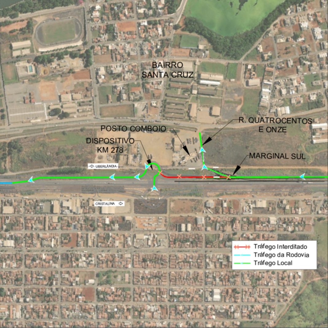 A marginal sul, no sentido Uberlândia, ficará interditada durante a operação. Motoristas que seguem de Cristalina para Uberlândia não devem acessar o dispositivo do km 278. A orientação é entrar à direita e utilizar o acesso pelo Posto Comboio, conforme a sinalização.