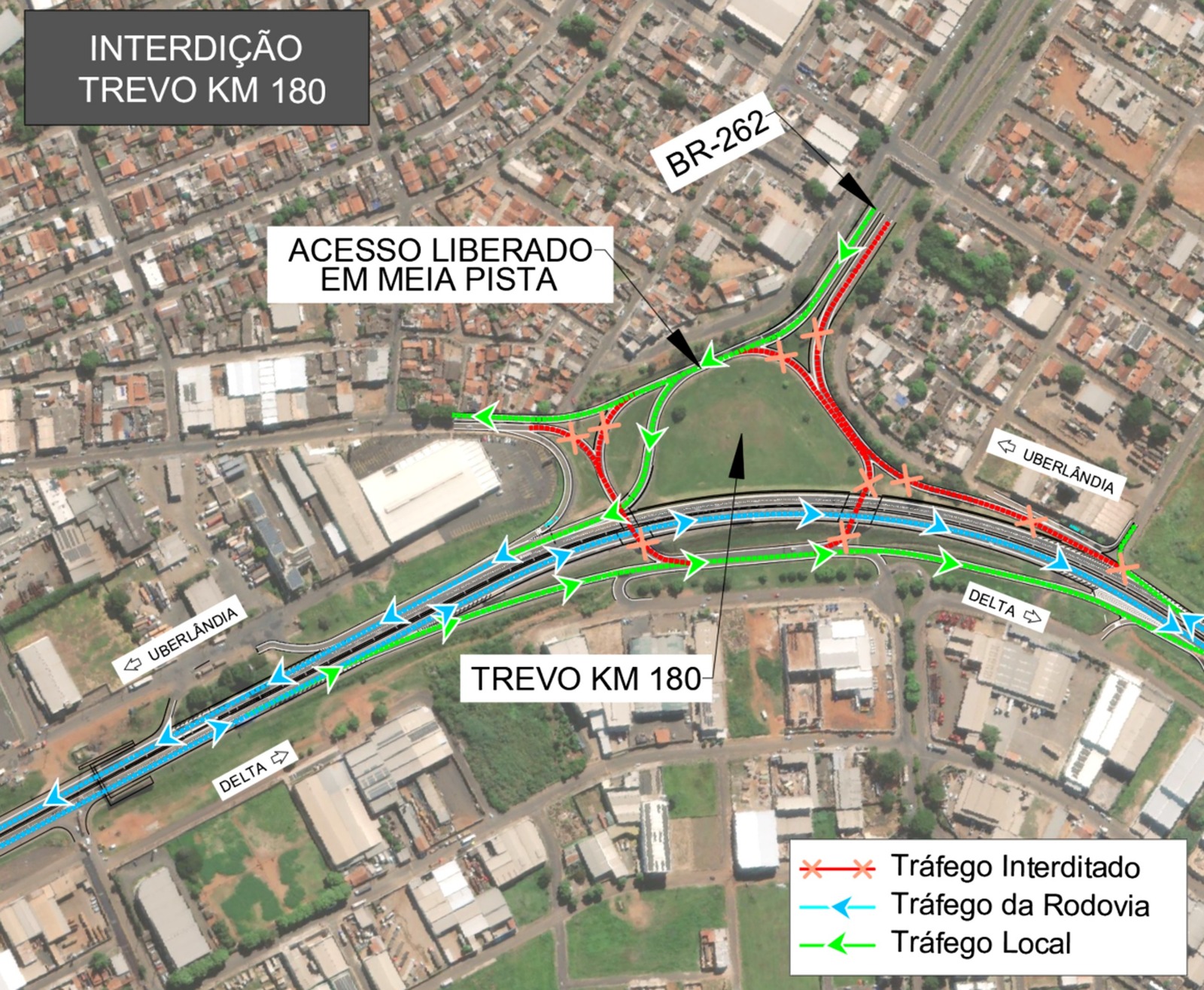 Na pista norte, sentido Uberlândia (MG), o acesso à BR-262 ficará interditado e os condutores deverão utilizar o retorno no km 181. Já na saída da BR-262 para acesso à BR-050, o tráfego funcionará em meia pista.