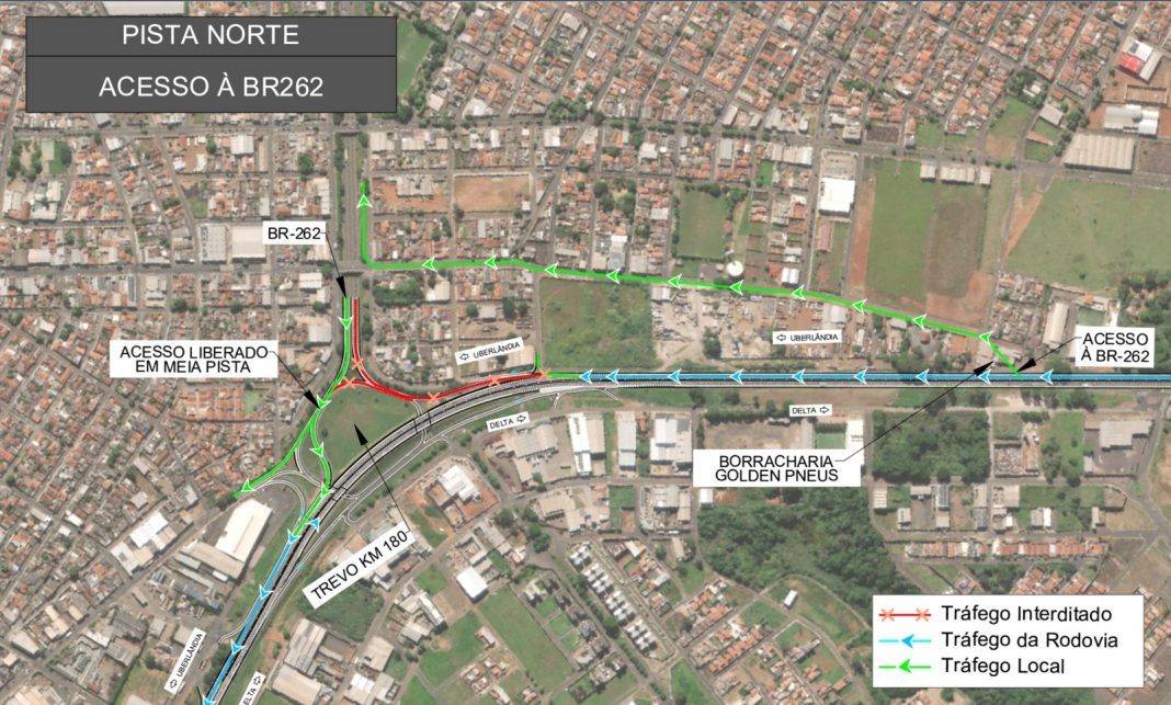 Na pista norte, sentido Uberlândia (MG), o acesso à BR-262 ficará interditado e os condutores deverão utilizar o retorno no km 181. Já na saída da BR-262 para acesso à BR-050, o tráfego funcionará em meia pista.