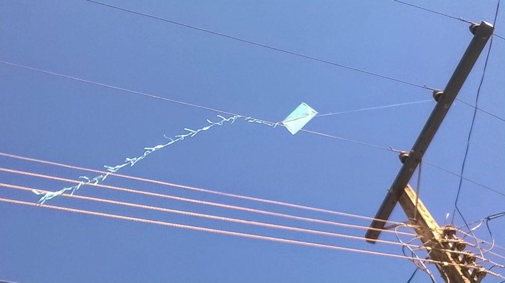 – Soltar pipas perto da rede elétrica é extremamente perigoso, sob risco da linha ou da pipa enroscar nos fios, ocasionando descarga elétrica. Além disso, materiais metálicos não devem ser utilizados na fabricação da pipa, pois conduzem eletricidade, aumentando a chance de choque elétrico, com risco de morte.
