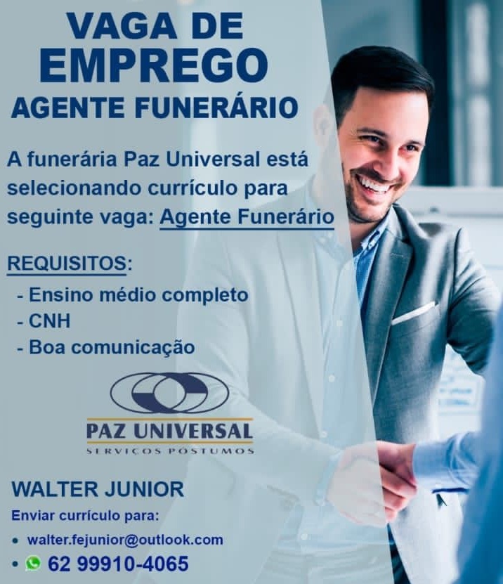 A Funerária Paz Universal, em Catalão, está selecionando currículo para a seguinte vaga: AGENTE FUNERÁRIO.