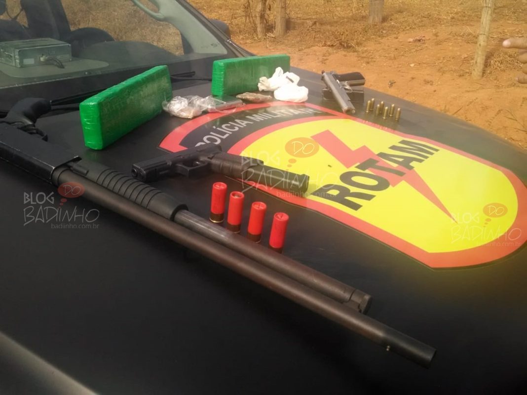 Durante as buscas um terceiro indivíduo foi preso e apresentado na Delegacia de Polícia Civil, onde foi autuado em flagrante por Posse Ilegal de Arma de Fogo e Tráfico de Drogas, o mesmo tinha sobre sua posse uma espingarda Cal 12, aproximadamente 2 Kg de maconha, porções de Cocaína e FORD/Ka de Cor Branca produto de roubo do dia 23/07/2018.