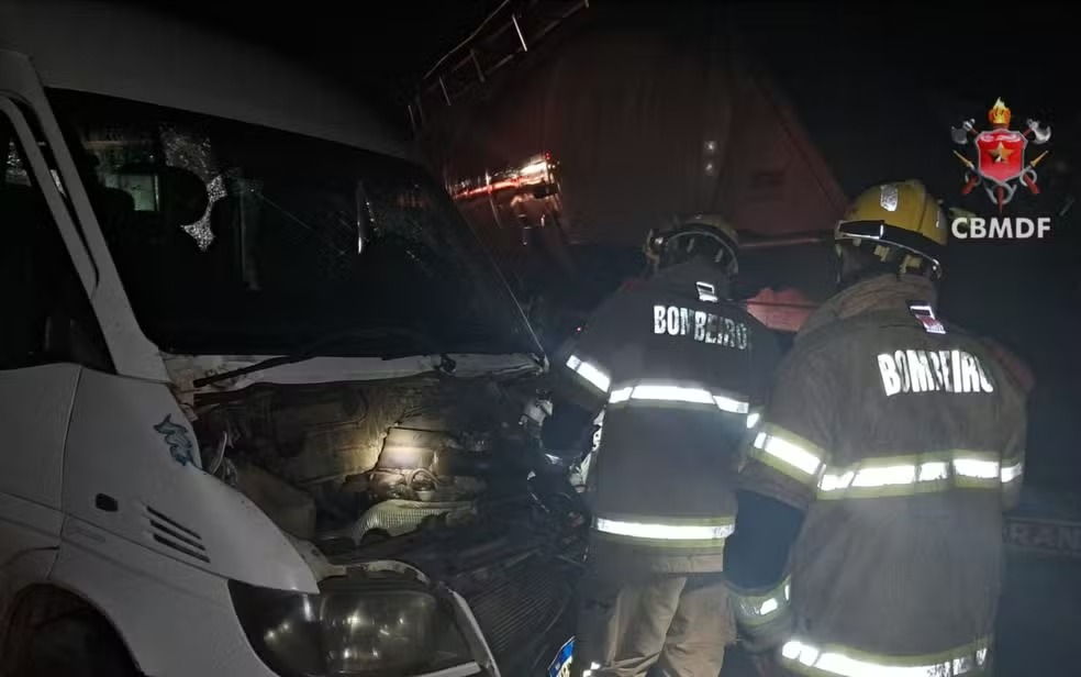 Nove estudantes ficaram levemente feridos após uma van fretada para o transporte universitário colidir com uma carreta na noite desta terça-feira (24), na BR-020, em Formosa, no Entorno do Distrito Federal.