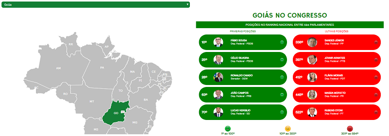 Já no âmbito geral – de acordo com as avaliações do Ranking dos Políticos – o estado de Goiás conta com os parlamentares Fábio Sousa (GO), Célio Silveira (PSDB), Ronaldo Caiado (DEM), João Campos (PRB), Lucas Vergilio (SD), Marcos Abrão (PPS) e Lúcia Vânia (PSB) entre os 100 melhores do País, oito posicionados entre 101º e 300º, além de cinco ocupando as colocações 301º a 594º. O último do ranking no estado é o deputado Rubens Ottoni (PT), que consta na 522º colocação.