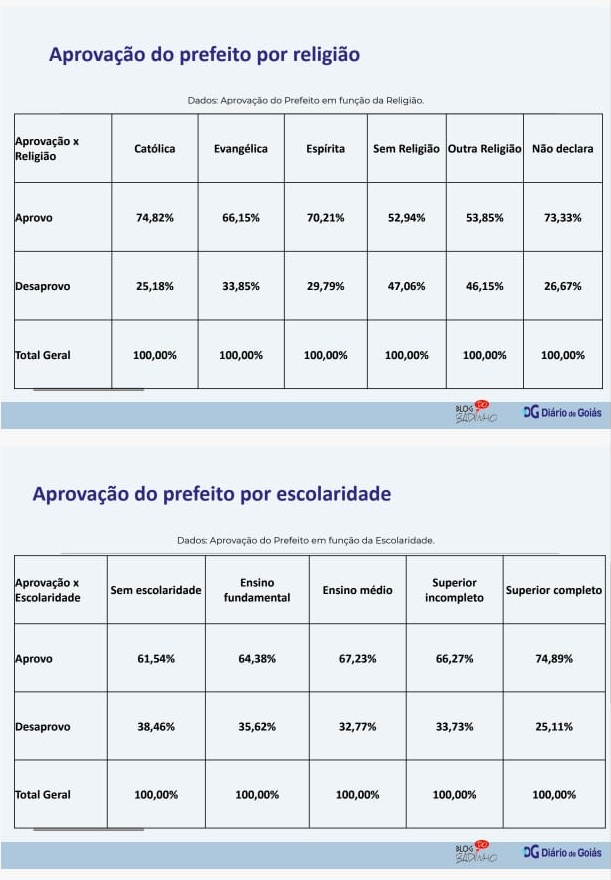 No recorte religioso, Velomar Rios apresenta maior aprovação entre os católicos, com 74,82%, contra 25,18% de desaprovação. Já entre os evangélicos, os percentuais são de 66,15% de aprovação e 33,85% de desaprovação.