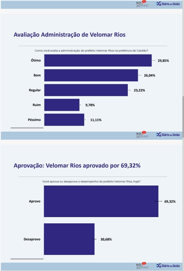 O primeiro ano da segunda gestão do prefeito Velomar Rios (MDB) alcançou 69,32% de aprovação entre os eleitores de Catalão ouvidos na pesquisa realizada pelo Blog do Badiinho em parceria com o Diário de Goiás. Por outro lado, 30,68% dos entrevistados afirmaram desaprovar a administração municipal.