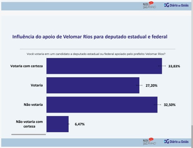 Outro ponto analisado foi o grau de influência do prefeito nas eleições de 2026, especialmente na disputa por vagas de deputado estadual e federal. Questionados se votariam em um candidato apoiado por Velomar Rios, 33,83% afirmaram que votariam com certeza, enquanto 27,20% disseram que votariam.