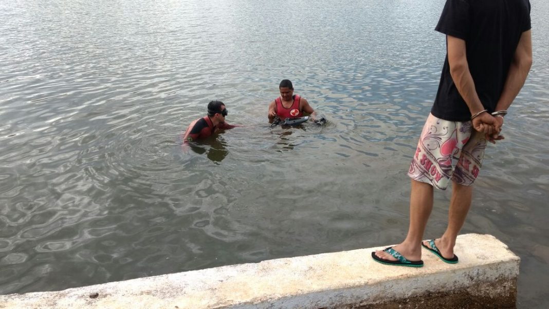 “Mergulhadores do 10º Batalhão de Bombeiro Militar retirando moto de dentro do local”