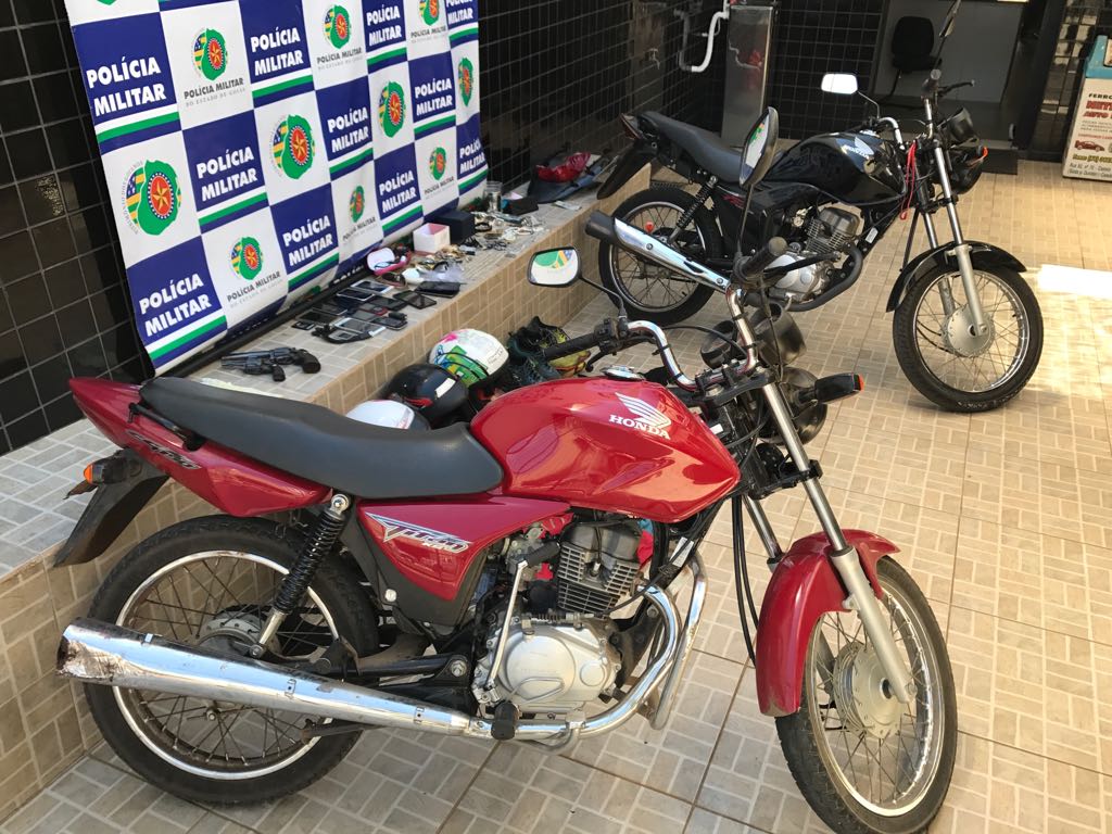 A moto roubada pela manhã na BR 050 e outra motocicleta, também produto de roubo, foram encontradas no local, além de três armas de fogo, munições de diversos calibres e vários celulares, relógios e joias produtos de roubo.