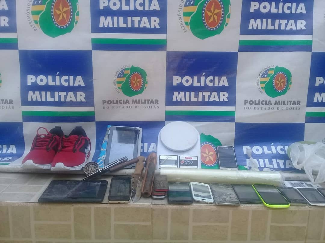 Também foram encontradas porções de drogas e material para sua embalagem, além de outros celulares, uns desmontados e outros não, objetos esses de procedência duvidosa, dinheiro e um simulacro de arma de fogo de madeira.