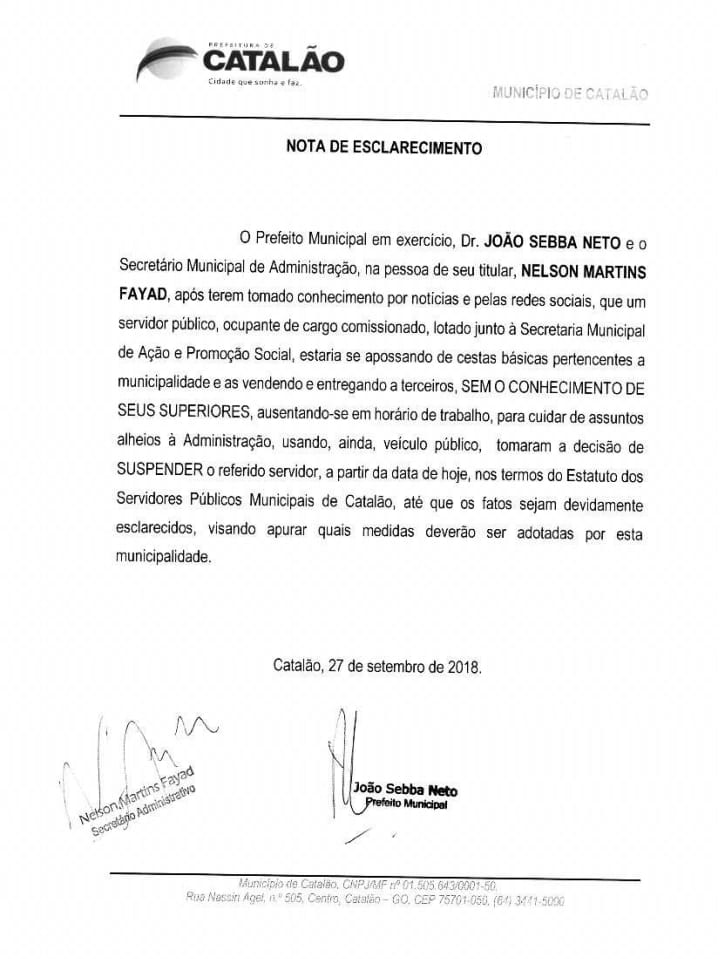 Assim que o Prefeito de Catalão em exercício, Dr. João Sebba (MDB) tomou conhecimento do fato, solicitou da Secretaria de Comunicação do munícipio confeccionasse uma nota, informando que o servidor teria sido afastado de suas funções, até que o caso fosse apurado.