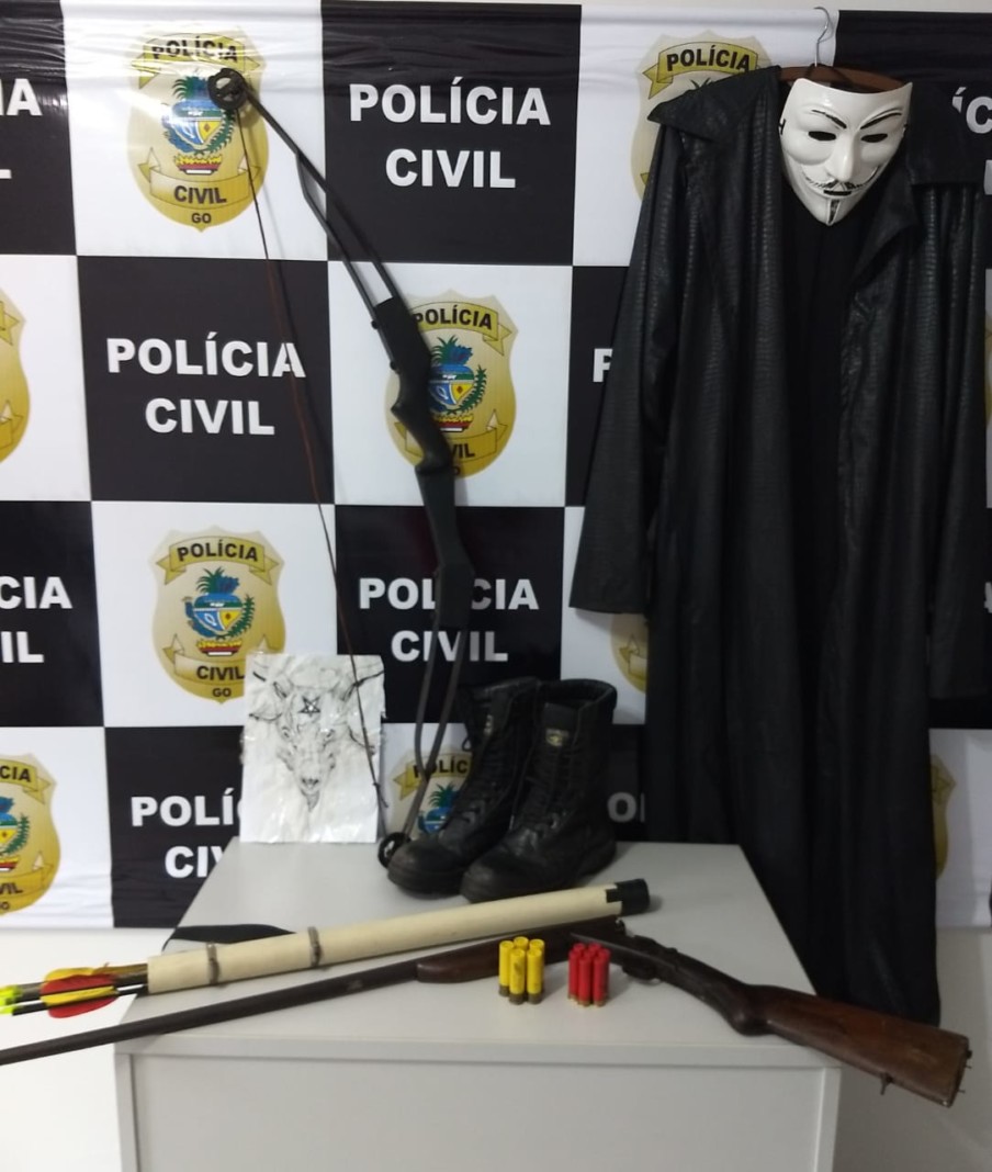 Também foi cumprido mandado de busca e apreensão na residência do adolescente, onde foram apreendidos uma capa, uma máscara, desenhos, um coturno e um arco e flechas. A polícia também recolheu uma arma de fogo e munições, as quais pertenciam ao pai do adolescente, que também foi autuado em flagrante.