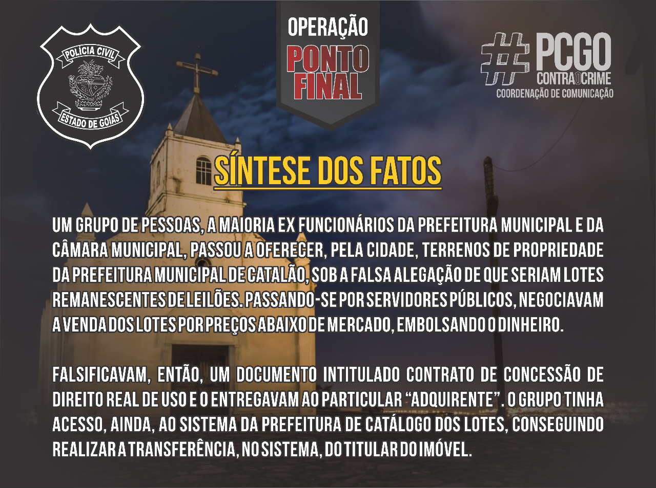 Em oito meses de investigação, a Polícia Civil de Catalão ouviu 60 pessoas, entre os particulares, funcionários públicos e demais investigados. Quatro pessoas foram indiciadas no inquérito que apurou os crimes de falsificação de documentos público, estelionato e organização criminosa.