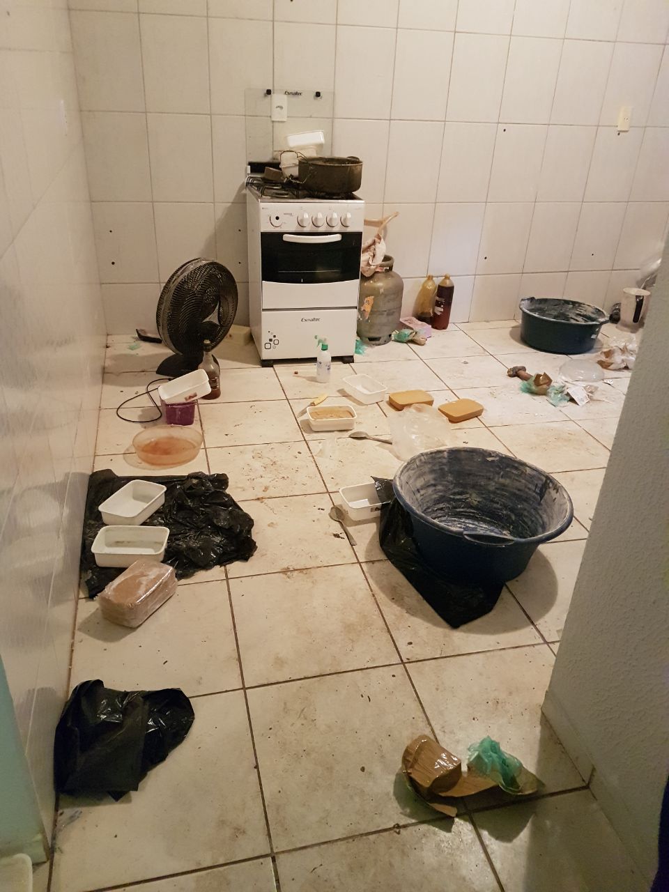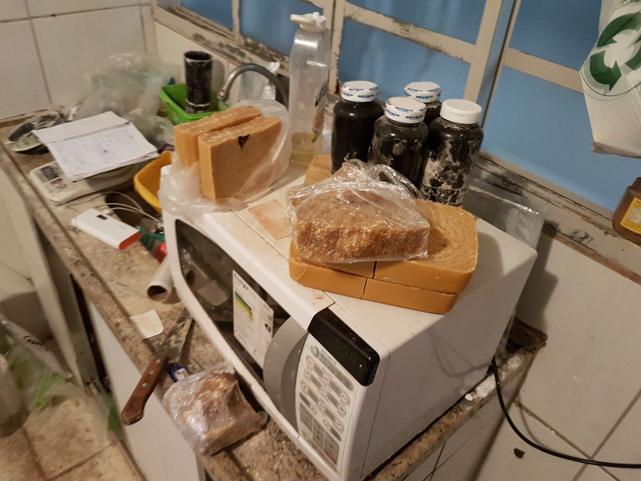 Durante a abordagem os policiais localizaram no interior da residência, a quantia de R$ 23 mil reais, três pistolas, munições, dois coletes balísticos, grande quantidade de drogas (12 kg de pasta base e 5 kg de cocaína), produtos químicos utilizados para refinar e misturar a cocaína aumentando seu volume, além de drogas em processo de secagem e outras processadas e embaladas prontas para o consumo.
