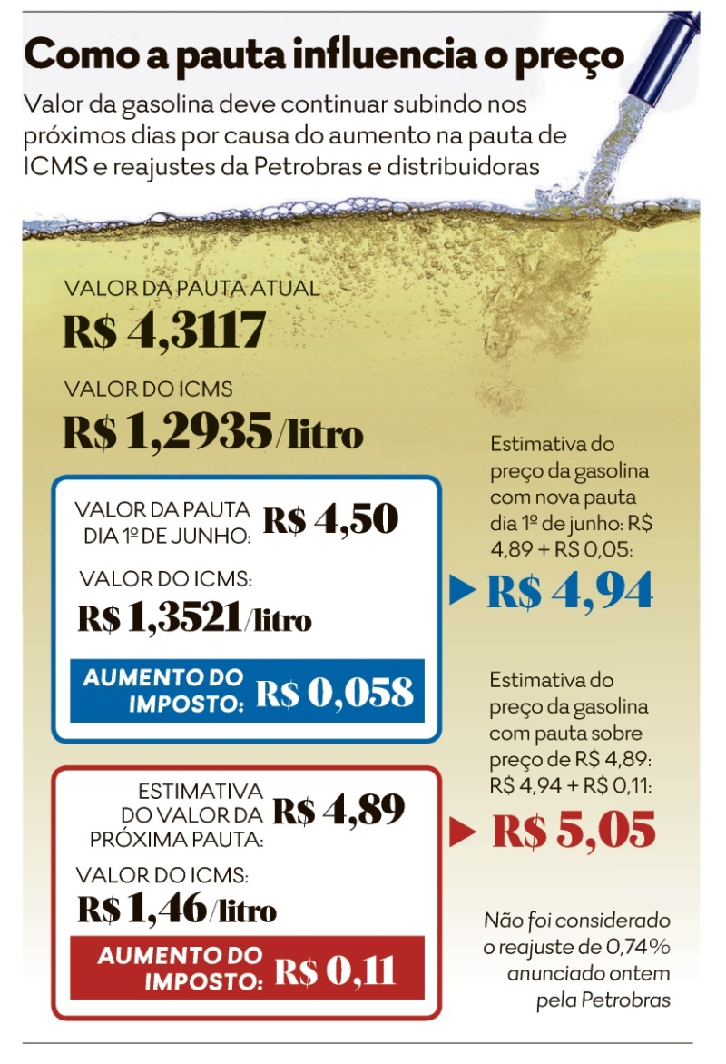 Com isso, o litro da gasolina pode passar dos R$ 5 em alguns postos. O novo valor da pauta vem se somar a um reajuste de R$ 0,15 feito nas distribuidoras, no início desta semana. De acordo com o Sindicato do Comércio Varejista de Derivados de Petróleo (ANP), o preço em algumas companhias passou de R$ 4,24 para R$ 4,39, por causa da redução da mistura de etanol anidro, que caiu de 27% para 18%, conforme autorizado pela Agência Nacional de Petróleo (ANP).