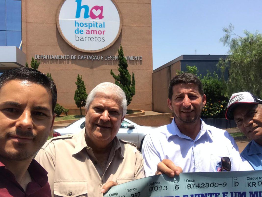 Juntos, eles fizeram a entrega do cheque simbólico e do comprovante de depósito bancário ao coordenador de captação do Hospital de Amor de Barretos, Carlos Gomes Pinheiros.