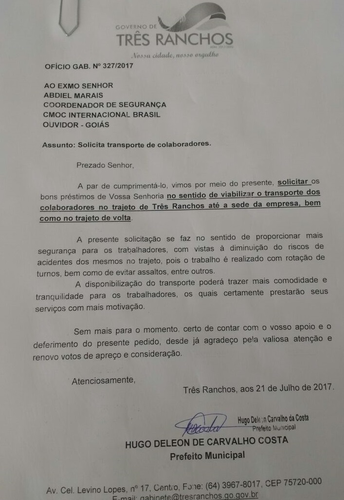 O prefeito de Três Ranchos, Hugo Delon, preocupado com a segurança de alguns colaboradores da CMOC  International Brasil, os quais são moradores de Três de Ranchos, solicitou via o ofício enviado para a empresa, que eles sejam buscados na cidade, pois atualmente os trabalhadores  tem que se deslocarem até a cidade vizinha de Ouvidor (cerca de 35 Km), para pegarem o transporte com destino a empresa.  Os trabalhadores vão de veículos próprios até Ouvidor, maioria deles, vão de motocicletas, o que aumenta os riscos de acidentes e algumas vezes até sujeitos a sofrerem assaltos, pois os trabalhadores fazem rotação de turno.