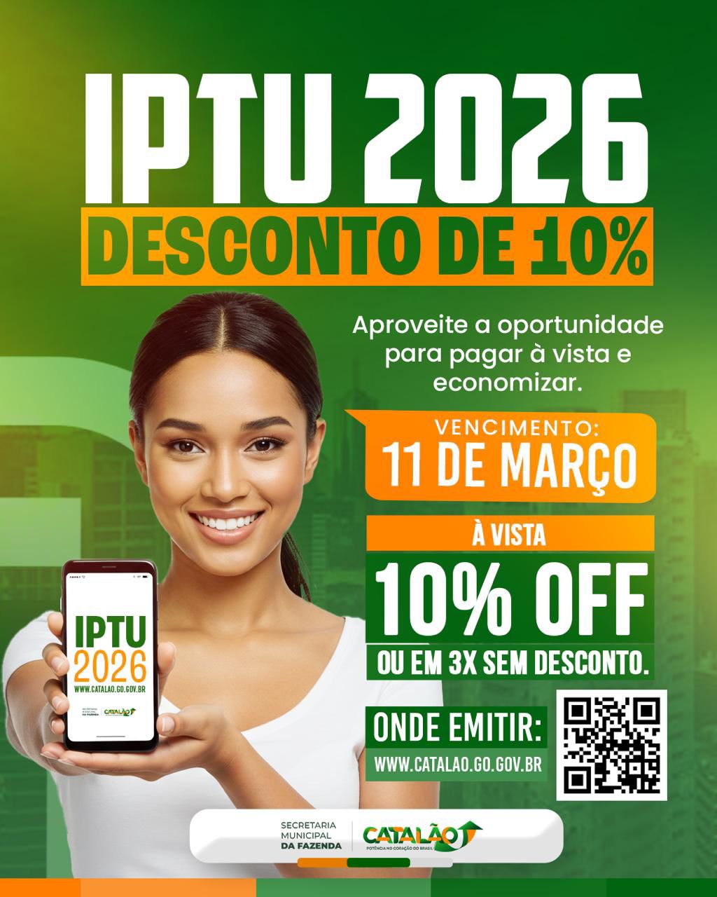A Prefeitura de Catalão informa que as guias de pagamento do IPTU 2026 (Imposto Predial e Territorial Urbano) já estão disponíveis para os contribuintes.
