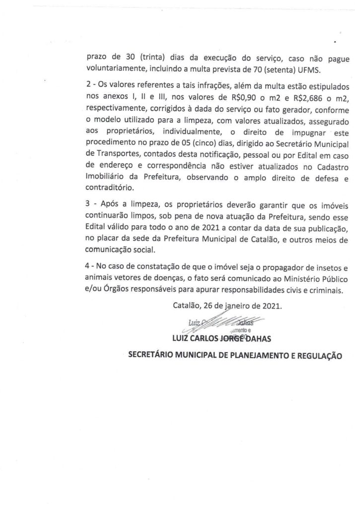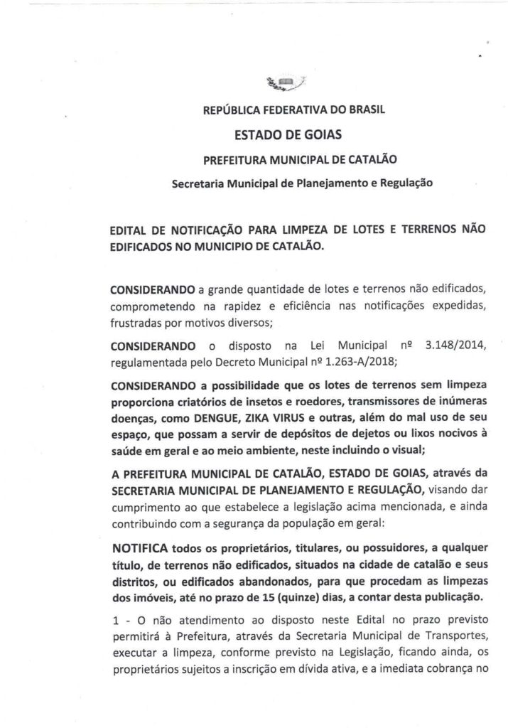 A Secretaria Municipal de Planejamento e Regulação do município de Catalão, publicou na última sexta-feira (29/01), um edital de notificação aos proprietários de lotes e terrenos aos quais ainda não foram erguidas edificações, para que os mesmos façam a limpeza imediatamente dos mesmos, sendo estipulado um prazo de 15 dias para que sejam promovidas as limpezas.