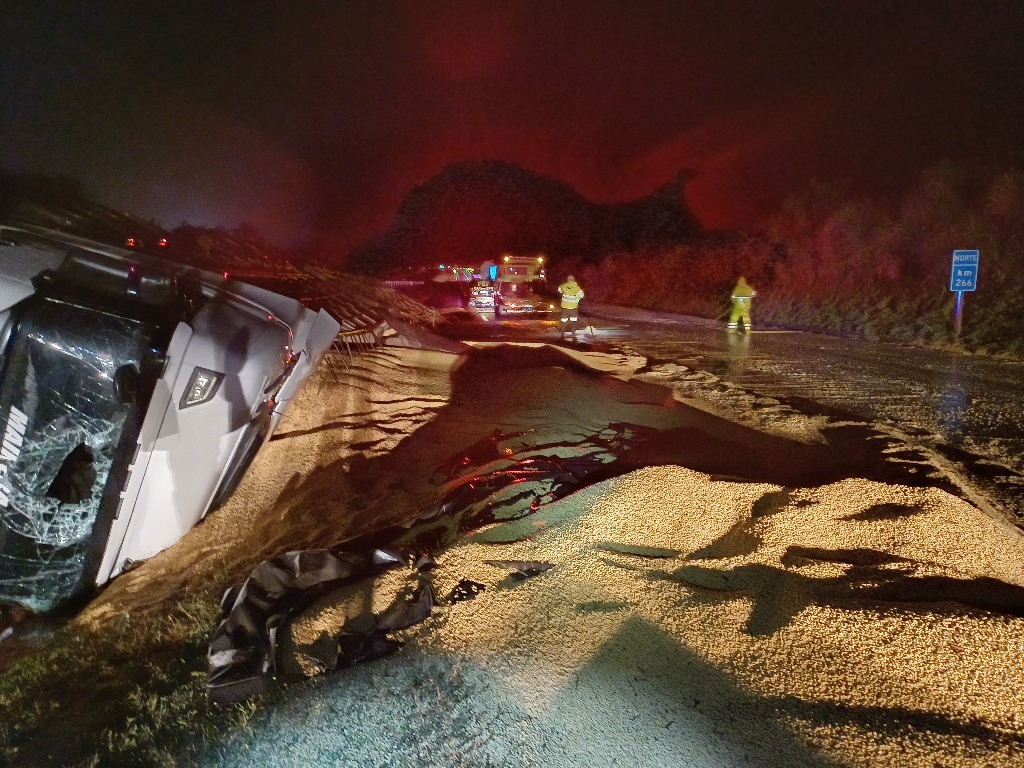 O primeiro acidente ocorreu na madrugada de sexta-feira (21), por volta de 01h00, no km 266 da rodovia. O acidente envolveu uma carreta carregada de soja, cujo condutor, um homem de 33 anos, perdeu o controle da direção, resultando no tombamento do veículo no canteiro central. No momento do acidente, também estava na carreta uma passageira. Ambos sofreram ferimentos graves e foram socorridos pelo resgate da concessionária responsável, sendo encaminhados para uma unidade hospitalar em Catalão.